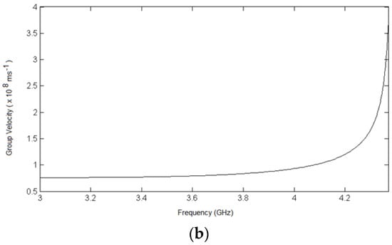 The center conductor of the curved Goubau line has a cross-sectional radius of 1mm. The dielectric material coating the Goubau line is a 3.8 mm thick layer of thermally cured gelatin/glycerin composite which has a dielectric constant of 60. Using the formula given in Equation (7), the cut-off frequency of the Goubau line was determined to be 4.36 GHz. Figure 2b shows the group velocity of the Goubau line as a function of frequency computed using the formula in Equation (6).