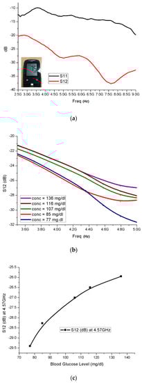 Measured results. (a) The measured S11 and S12 parameters against frequency when the blood glucose level was 75 mg/dl; (b) the measured S12 parameters as a function of frequency for different blood glucose levels (as denoted as “conc” in the graph). It is important to note that the blood glucose levels in this graph were obtained using the traditional lancing method within 15 m before the measurement of the S-parameters was conducted; (c) a graph showing the near-linear relationship between the blood glucose levels and the S12 parameters right at 4.57 GHz.