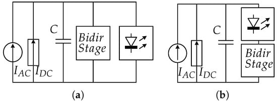 To process the power at the link, two possibilities can be used, based on the connection of the stage and the LED lamp. Figure 1 depicts both cases, and as it can be seen, the equivalent circuit of the input PFC stage is modeled by a current source, , in parallel with an current source, , charging the link capacitor, C.