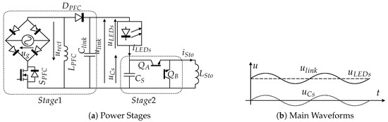 A second strategy divides the output power of the input stage in two different power flows. The largest share of this power is delivered directly to the LED lamp, while the rest of the power (including the part) is processed by a second stage. This ensures the power ripple cancellation at the load [29,30,31,32]. Upon careful design considerations, this scheme provides an overall system efficiency increase, as most of the power is processed only once.