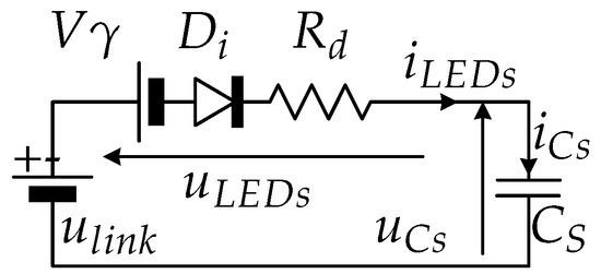 The expression of the current ripple through the LEDs can be calculated considering Mode II. In this interval, the capacitor current, , equals the current through the LEDs. Considering that the link behaves as a voltage source at , then the resulting circuit for this subinterval can be seen in Figure 5, in which the LEDs assembly is modeled by a series connection of an ideal diode , a dynamic resistor , and a threshold voltage . Therefore the ripple of the current through the LEDs can be calculated considering an exponential discharge through the dynamic resistance of the LEDs, :