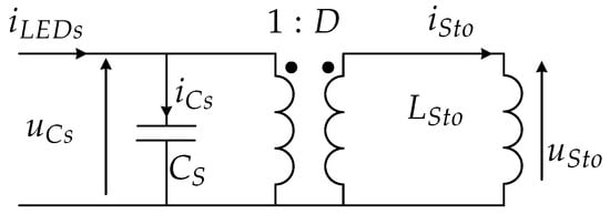 The value of the storage inductor, , can be calculated considering the performance of the system. The first approach, taken into account in [33], is to supply the system in open loop, with a constant duty ratio, in this case , and check the evolution of the waveforms. Upon these conditions, the inductor is chosen as follows. From Figure 6, for a constant duty ratio, and after referring the inductance value to the primary side of the equivalent transformer, the expression for the current through the LEDs becomes: