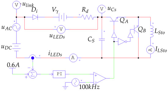 Figure 3a details the topology of the system. A grid-side PFC stage is implemented by means of a Discontinuous Conduction Mode () buck-boost converter, in order to provide unity power factor with constant duty ratio. This input stage supplies power from the grid towards the link. Connected to this DC link, the proposed bidirectional series circuit can be seen. This stage is a current-fed bidirectional buck converter, formed by switches and , capacitor and the storage inductor, . The input of this stage is considered to be the LEDs current, , with the output variable being the current through the inductor , . and have been represented as bipolar transistors for simplicity, as they must be able to block reverse voltages. In the final prototype, they will be implemented by means of MOSFET transistors with a series blocking diode. Figure 3b depicts again the main voltage waveforms at the driver, sharing the time axis.