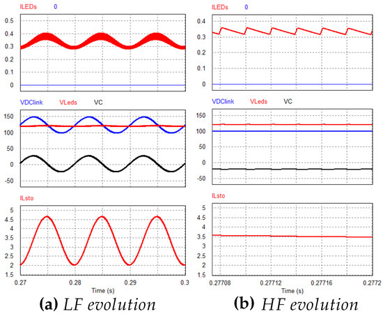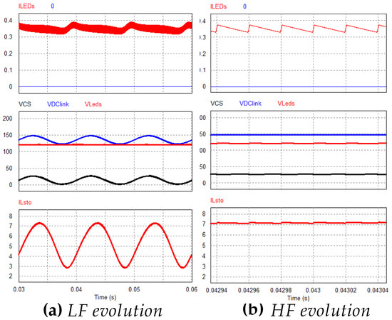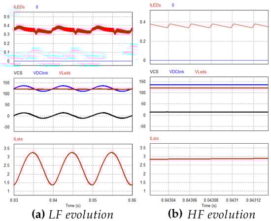 In Figure 8a, the evolutions of link voltage, the capacitor voltage, and the LEDs voltage are shown. As it can be seen, all the voltage of the link is held by , and thus the LEDs voltage is a voltage. The resulting LEDs current can also be seen, still presenting a 100 Hz ripple, although for requirement applications it could be considered acceptable, as some directives allow relatively high HF harmonics levels [34]. Figure 8b shows the switching system waveforms at 50 kHz, again at full power level. Even though the design provides good results in terms of ripple cancellation and efficiency, the overall size ( for a 40 W converter) results too high, implying an unfeasible solution. In order to achieve a smaller core size, an analysis of the closed-loop control of the system will be carried out, and, as it will be demonstrated, results in a smaller inductor value for the same current ripple cancellation levels.