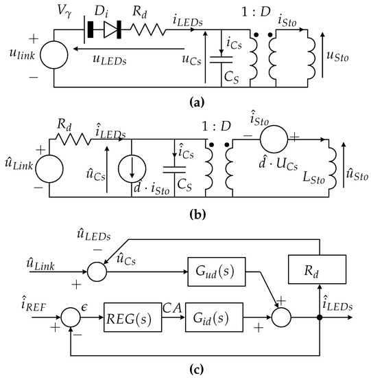 Figure 9a depicts the equivalent model of the second stage including the LEDs assembly. The voltage source models the output voltage behavior of the input stage, including both the and the ripple voltage components at the link capacitor. As in the previous discussion, the equivalent circuit that models the LEDs assembly is formed by an ideal diode, , in series with a source, , and a resistor, . and account for the total threshold voltage and the total dynamic resistor of the LEDs setup, respectively. After following a small-signal analysis approach (linearize and perturb) [33], the final small-signal model of the circuit is shown in Figure 9b. After some calculations, the transfer functions of the system are finally given by: