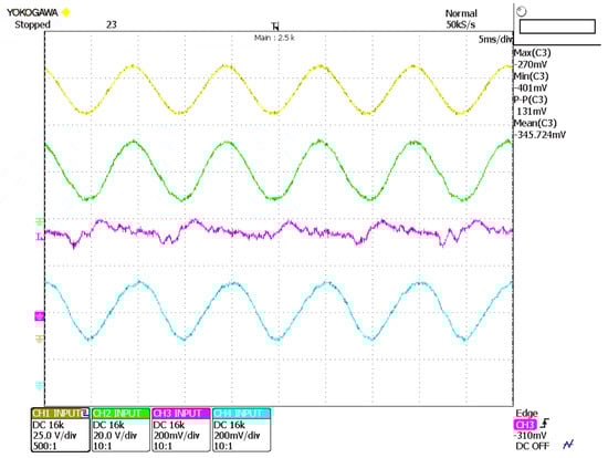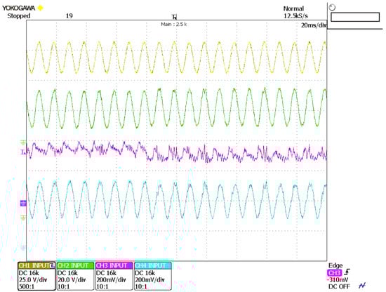 Experimental results of the closed-loop system (5 ms/div). CH1 (yellow): (25 V/div). CH2 (green): , (20 V/div). CH3 (magenta): (200 mA/div). CH4 (blue): (200 mA/div).
