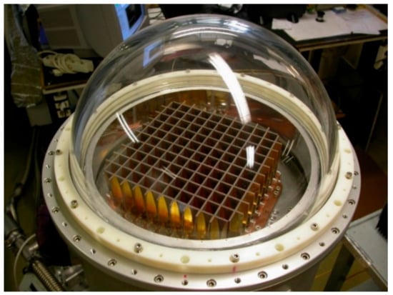 PHAROS (phased arrays for reflector observing systems) [6,7,8,9] is a cryogenically cooled PAF demonstrator with analogue beamformer based on an array of dual polarization 10 × 11 Vivaldi antennas (see a picture in Figure 1) designed for radio astronomy observations across the 4–8 GHz band. The Vivaldi array utilizes high-performance Taconic printed circuit boards (PCBs) based on a three-layer laminated board structure. The complete PHAROS focal plane array was built with 11 boards in both the x and the y directions, each integrating 10 Vivaldi antenna elements with 21 mm spacing. The spacing-to-wavelength ratio is 0.56 at the PHAROS maximum operating frequency of 8 GHz (λmin = 37.5 mm). The overall size of the array on the x-y plane is ≈ 230 × 230 mm2, i.e., 6λmin × 6λmin (and equivalently 3λmax × 3λmax for λmax = 75 mm, relative to the 4 GHz minimum frequency). Only a sub-set of 24 elements of the array with same polarization is populated with cryogenic low noise amplifiers (LNAs), while the non-active elements are terminated into 50 Ω loads. The non-active elements add negligible noise contribution due to their low operating temperature of ≈20 K.