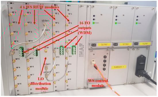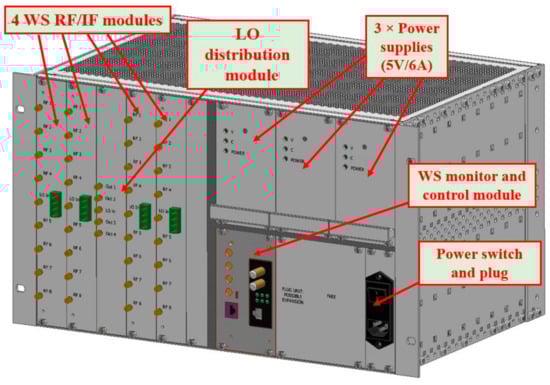 A 3D view of the WS 32-channel receiver, equipped with all its modules, is given in Figure 3. The WS includes four eight-channel WS RF/IF modules, one LO distribution module and one WS monitor and control module arranged in a standard rack with a size of 6U × 19-inch (where 6 rack units = 266.7 mm). The receiver performs signal filtering by using a switched filter bank, signal conditioning, and single frequency down-conversion of a section of the 2.3–8.2 GHz RF band down to the 375–650 MHz IF band (275 MHz instantaneous bandwidth). The down-conversion scheme utilizes sideband separating mixers in lower side band (LSB), with the upper side band (USB) being internally terminated. The IF signals are converted to optical signals by an analogue wavelength division multiplexing (WDM) IFoF fiber-optic transmitter (OTX) that transports two IFs over a single optical fiber.