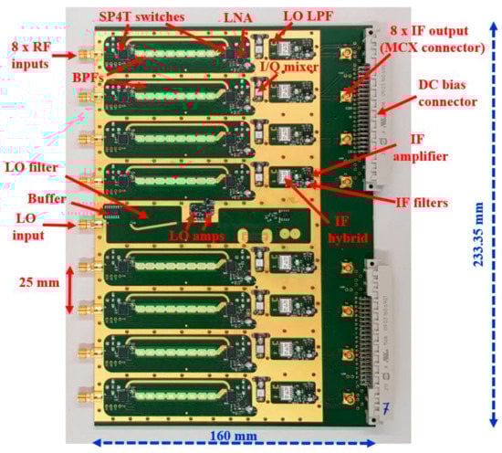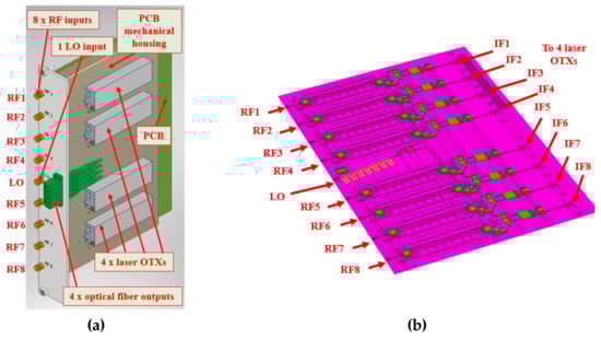 (a) Design of the Warm Section (WS) radio frequency (RF)/intermediate frequency (IF) module showing the eight RF inputs, the local oscillator (LO) input, the quad Lucent Connector/Angle Polished Connector (LC/APC) fiber-optics connector, the printed circuit board (PCB) and its mechanical housing (left panel); (b) Design of the PCB with RF, LO and IF components. The size of the PCB is 160 mm × 233.35 mm.