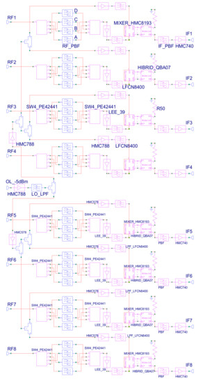 NI-AWR Microwave Office (version 14, National Instrument-Applied Wave Research, El Segundo, LA, USA, 2018) schematic of the eight-channel WS RF/IF receiver chain implemented on the PCB with models of the adopted commercial components: SP4T RF switches (Peregrine PE42441, pSemi corp., San Diego, CA, USA), RF MMIC LNAs (Mini-Circuits Lee39+, Brooklyn, NY, USA), I/Q mixers (AD HMC8193, Analog Devices Corporate, Norwood, MA, USA), IF 90 deg hybrids (Mini-Circuits QBA-07+, Brooklyn, NY, USA), IF MMIC amplifiers (AD HMC740, Analog Devices Corporate, Norwood, MA, USA), LO gain block (AD HMC788, Analog Devices Corporate, Norwood, MA, USA).