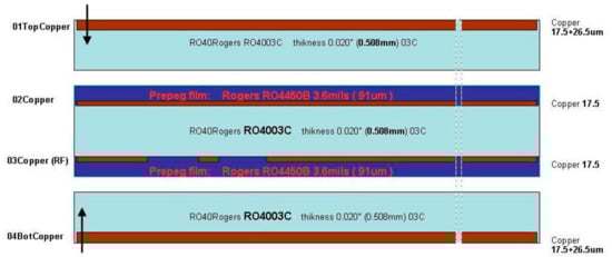 The PCB adopts the standard double-height Eurocard size (6U) that can be plugged into a standard chassis which, in turn, can be mounted in a 19-inch rack. A cross-section view of the PCB (total thickness ≈ 1.76 mm, including substrates, prepegs and metallization) is shown in Figure 6. Metalized via holes are employed to connect the different metallization layers.