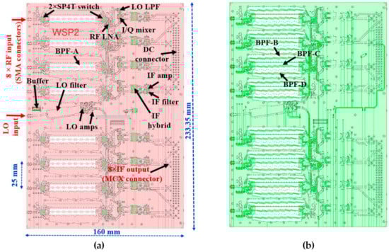 WS RF/IF board design. View of two different PCB layers. (a) Top metallization layer with components showing the BPF-A layer; (b) Metallization layer n. 3, showing the BPF-B, BPF-C and BPF‑D.