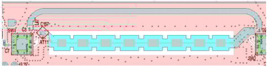 Detail of the switch filter bank section showing the BPF-A between two commercial ultra CMOS SP4T RF switches (Peregrine PE42441).