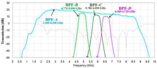 Figure 9 plots the simulated RF transmissions that would be obtained by selecting the four BPFs. The simulated response of the filters closely matches the specified ones in terms of passband (bandwidth at half-power points), insertion loss, return loss, in-band ripple, stop-band attenuations, and size.