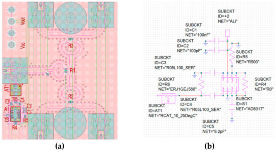 (a) Design of four-way local oscillator splitter for the 2.950–8.575 GHz band. The LO input is on the left. The outputs are arranged symmetrically: two are on the top, two on the bottom; (b) Schematic circuit of the LO power monitoring.