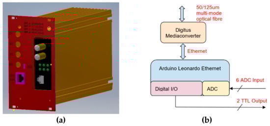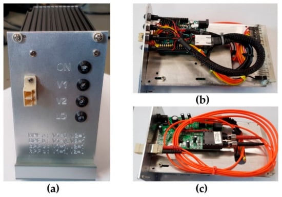 Warm Section control module and its parts. (a) Front panel with TX/RX multimode fiber connector pair and LEDs. (b) Microcontroller by Arduino Leonardo ETH. (c) Optical fiber to Ethernet media-converter (Digitus DN-82010, Lüdenscheid, Germany).
