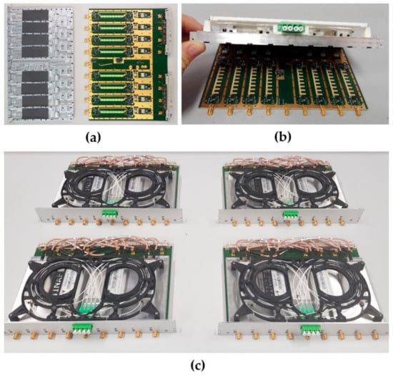 Photos of the WS RF/IF module. (a) Mechanical housing (Left) and PCB (Right) before assembly. Microwave absorbers are glued in the pockets of the PCB mechanical housing to mitigate cavity resonances on the RF circuitries. (b) PCB board (first prototype version) and mechanical housing during assembly with optical transmitters. (c) Four fully assembled WS RF/IF modules, with OTXs sandwiched between mechanical housing and plastic supporting four routing the optical fibers to the quad LC/APC connector.