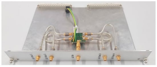 Each of the WS RF/IF modules (Figure 4) includes a PCB circuit and four WDM fiber-optic transmitters (OTXs) attached on opposite sides of a mechanical support. The RF/IF module has eight SMA (SubMiniature version A) RF input connectors, one SMA LO input connector centered on the front panel, and one quad LC/APC (Lucent Connector/Angle Polished Connector) output connector to extract the four WDM G652D IFoF optical fiber outputs provided by the four OTXs. Figure 5 shows a schematic of the receiver chain implemented on the board. The module employs a single four-layer PCB based on RG4003C (Rogers Corporation, Chandler, AZ, USA) substrate with a thickness of 0.508 mm and commercial surface-mounted components soldered in place (no bonding required).