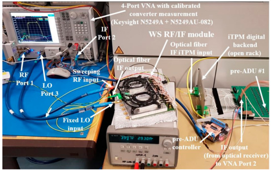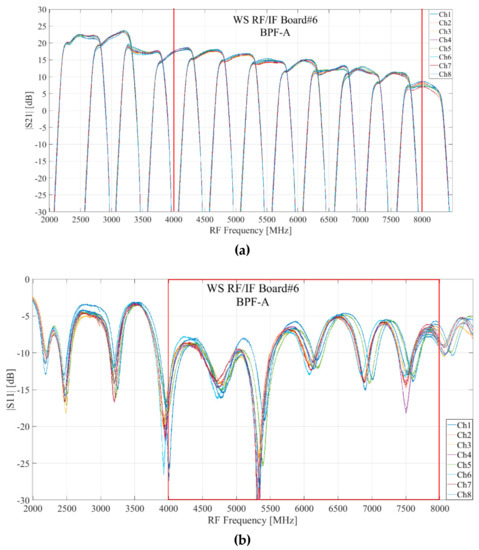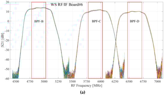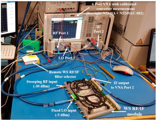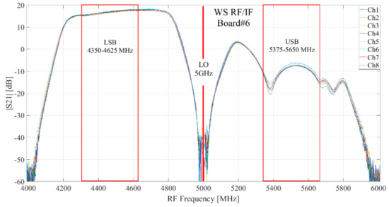 We characterized the eight-channel WS RF/IF modules before assembling them in the two receiver racks. For the tests, we utilized a 4-port VNA (vector network analyzer) equipped with calibrated converter measurement capabilities (Keysight N5249A and N5249AU-082, Keysight Technologies, Inc., Santa Rosa, CA, USA). We calibrated out the effects of the coaxial cables from the VNA ports to the WS RF/IF module ports. We developed a MATLAB script for automatic data acquisition, processing and analysis of the WS boards’ VNA test results.