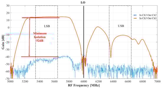 Measured board #2 transmission from two contiguous channels (channel 3 and channel 2) for filter BPF A with LO set at 6 GHz: the ratio between the signal gains (LSB gains) provides the channel-to-channel isolation. The board was integrated into the module with mechanical support.