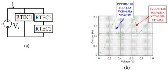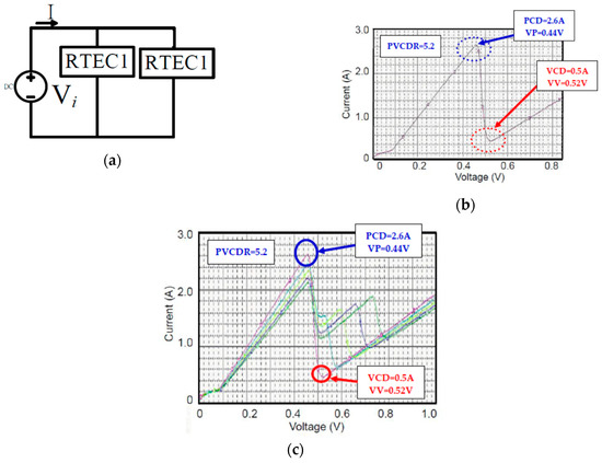 Two RTEC units, each is expressed as above, were in parallel to each other, as shown in Figure 5a. Cp, RS, and LS of paralleled RTEC units were all the same as those of the single PVCDR RTEC unit. In this simulation, the design of the double paralleled RTEC units obtained a PCD value as high as 2.6 A because of the decline of series resistances. The characteristic of double PVCDR values was not observed because of the unsuitable selection of RS value for the paralleled RTEC units, as shown in Figure 5b. When the RS of the first RTEC unit was large enough and the RS of the second RTEC unit was appropriately regulated, the characteristic of double PVCDR values will be clearly appeared, as shown in Figure 5c. In this research result, it revealed that although the RS has possessed the optimum values both in the first and in the second RTEC units, two PVCDR values and two PCD values in the double PVCDR RTEC were separately less than those in the single PVCDR RTEC, even though the double PVCDR phenomenon has been produced.