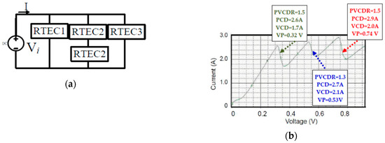 Another method of improving double NDR curve was designed as shown in Figure 7a. The third RTEC unit was in series with one of two RTEC units in the double PVCDR RTEC unit, as exhibited in Figure 7a. In this configuration, the PVCDR values were heightened, as revealed in Figure 7b, in which the PVCDR values were respectively 1.89 and 1.68, and the PCD value reached about 1.80 A.