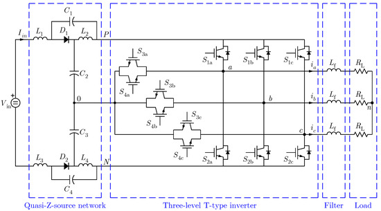 The power circuit is shown in Figure 1. Two identical quasi-Z-source networks are connected to a common node between capacitors and . These networks are linked to a T-type three-level VSI.