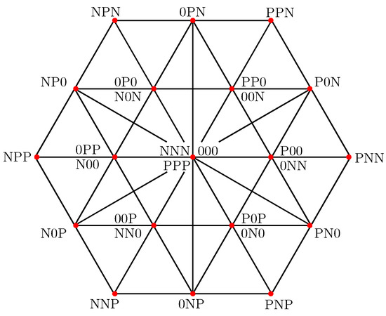By means of diverse switching combinations, a voltage waveform with three possible voltage levels, , 0, and , was obtained at each converter leg. In the switching scheme used in a traditional three-level VSI, the output of each phase (a, b, c) can be in either P-, 0-, or N-state (i.e., connected to the positive (P), the neutral (0), or the negative (N) terminal, respectively). Three phases and three states were combined to form 27 valid switching states, depicted in Figure 2, in the well-known space vector representation for a three-level converter.