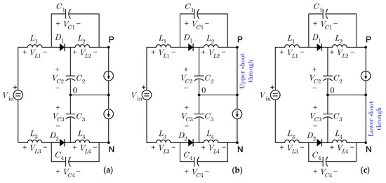 Equivalent circuits for (a) non-shoot-through (NST) state, (b) upper shoot-through (UST) state, and (c) lower shoot-through (LST) state.