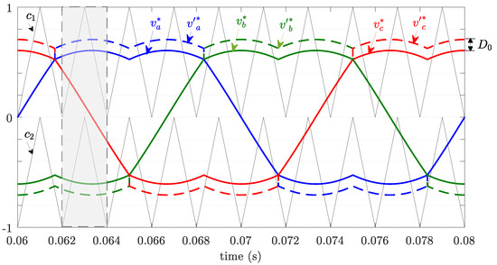 The reference and carrier signals are displayed in Figure 4 for the case of m = 0.7 and . A switching frequency value of 500 Hz (i.e., a frequency modulation index ) was used for better visualization. Three modulating signals , , and were used as in the traditional PWM scheme. These signals were obtained by using the well-known technique based on the addition of a common offset voltage, Voff, to the three phase references [17,31]: