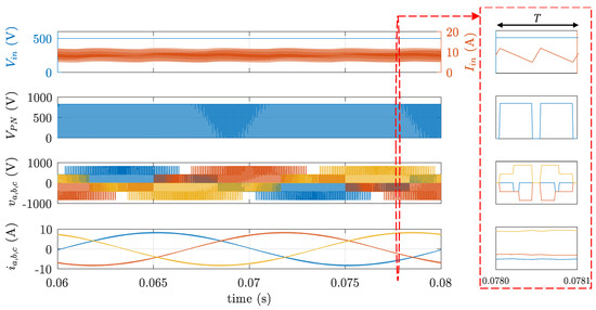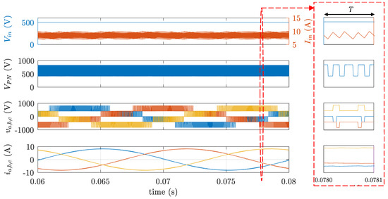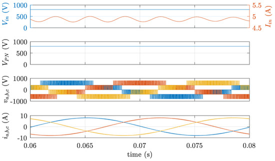First, it was assumed that the output voltage of the PV array was at its maximum value of 800 V. In this case, to synthesize the required output grid voltage (in the range 380–420 V line-to-line RMS), the modulation index and UST/LST duty cycle were fixed to m = 0.8 and . Boost operation was not needed, so the inverter operated in the VSI mode. Figure 6 shows the simulated waveform for this case. The current drawn from the PV array () was almost ripple-free since no shoot-through states were activated. The DC-link voltage () was not boosted (B = 1), and it was maintained at almost 800 V. The output line-to-line voltages () were composed of the levels 0, ±800/2 V, and ±800 V. The RMS value of the fundamental component was 390.9 V, which was within the desired range. The corresponding phase-to-neutral peak voltage of 319.16 V matched the expected value, according to Equation (2).