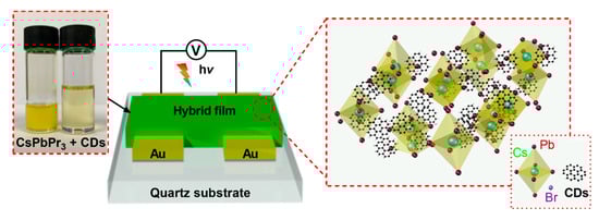 Figure 1 illustrates the structure of the CsPbBr3/CD hybrid composite photodetector fabricated on the quartz substrate. Initially, Cr/Au (4 nm/80 nm) were thermally deposited on the quartz substrate by standard lithography, thermal evaporation, and wet etching, yielding electrodes with a total effective area of 2 × 10−4 cm2 (Figure S1). The left image in Figure 1 shows the emission colors of the CsPbBr3 and CD solutions under white light. The CsPbBr3 solution emitted typically yellow light while the CD solution showed a watery emission [,,]. The right image in Figure 1 is a schematic of the composite materials containing mixed perovskite nanosheets and CDs. The small square shows the unit cells of CsPbBr3 and the CDs. The unit cell of perovskite nanosheets is typically a cubic structure formed by Pb and Br bonded to both Cs atoms []. In contrast, the carbon nanodots form a spherical graphitic-like structure []. The CsPbBr3/CD composite film on glass was almost 200 nm thick (as verified by a step profiler) and was both compact and uniform (Figure S2). It is also worth mentioning that the film thickness of the CsPbBr3/CD composite film (200 nm) was actually thinner than that of the pure CsPbBr3 film (228 nm), which indicated that the thickness of composite film was slightly reduced when the carbon nanodots were incorporated []. This could have resulted from viscosity changes of the composite solution after the addition of the carbon nanodots. However, as discussed later in this section, the morphology of the CsPbBr3 and CsPbBr3/CD composite film was analyzed to point out the role of the CDs.