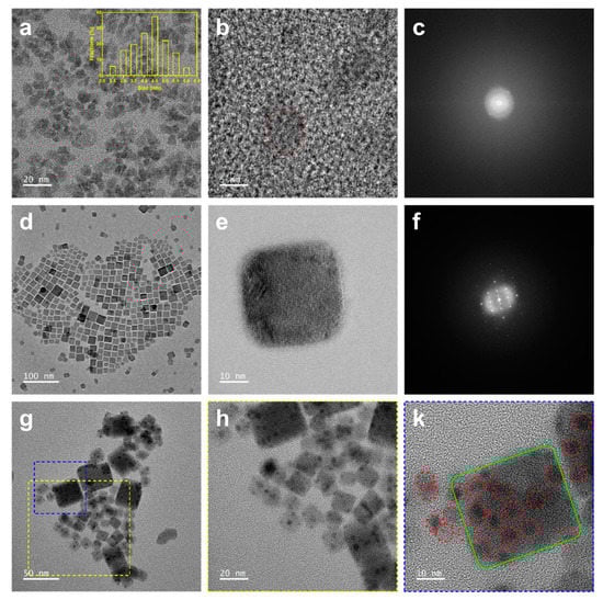 The crystal structures and qualities of the CDs, CsPbBr3, and CsPbBr3/CD were determined from the low-magnification and high-resolution (HR) TEM images and from Fourier transform images (see Figure 2). The CDs were narrowly distributed in size, with an average diameter of ~4.5 nm (Figure 2a). The lattice fringes (0.21 nm) of the CD structure are clearly seen in Figure 2b (see also Figure S3a), and the fast Fourier transform image of the selected area (enclosed by the dashed red circle in Figure 2b) revealed the high crystallinity of the CDs [,]. TEM and HRTEM images of the CsPbBr3 nanosheets are shown in Figure 2d,e, respectively (see also Figure S3b). These images clarified the cubic structure of the perovskite nanosheets, with a lattice fringe of approximately 0.58 nm []. Moreover, the Fourier transform image in Figure 2f confirmed the crystalline structure of perovskite. Meanwhile, in the TEM image of the sample combining the CDs with the CsPbBr3 nanosheet solution, evidence of both materials was expected. The presence of both materials was indeed confirmed in TEM images of the composite sample (Figure 2g,h,k). Carbon nanodots (dashed red circles) and perovskite nanosheets (green-lined square) are clearly shown in Figure 2k. Moreover, to clarify that these nanodots were CDs alone, we magnified their structure, as seen in Figure S3c,d. These images clearly reveal the hexagonal honeycomb structure of graphite [].