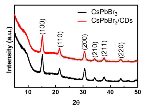 The CsPbBr3 and CsPbBr3/CD composite films were further characterized by their powder XRD patterns. The XRD spectra are displayed in Figure 3. The peaks in the spectra of the CsPbBr3 film, labeled 100, 110, 200, 210, 211, and 220, corresponded to the cubic crystalline structure of CsPbBr3 nanosheets as reported elsewhere []. However, the peaks in the XRD spectra of the CsPbBr3/CD corresponded only to the cubic structure of CsPbBr3; the characteristic CD peaks were absent. According to the literature, the XRD patterns of CDs exhibit one peak between 2θ = 20° and 2θ = 30° (depending on the size, structure, and synthesis process of the CDs) []. The discrepancy might be attributable to coverage of the 4.5 nm-diameter CDs by the considerably larger perovskite nanosheets, which might have dominated the XRD detection. Supporting this idea, the XRD pattern of perovskite and carbon nanotube composite film in a previous study showed only the peaks of the perovskite structure [].
