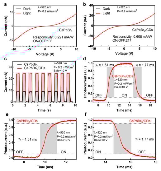 The performance of a photodetector based on the CsPbBr3/CD hybrid composite film was compared with that of a photodetector based on pure CsPbBr3. The photoelectrical measurements were performed under a 520-nm laser diode with a light intensity of 0.2 mWcm−2. The I–V characteristics of the pure CsPbBr3 and CsPbBr3/CD hybrid composite photodetectors are shown in Figure 5a,b, respectively. It can be observed that the I–V curves for the pure CsPbBr3 and CsPbBr3/CD hybrid composite photodetectors is symmetrical since the photocurrent value of each device (at –10 V and 10 V) were almost the same []. The dark currents of the photodetectors based on pure CsPbBr3 and the CsPbBr3/CD composite film were 0.09 and 0.12 nA under a 10-V bias voltage, respectively. This result was expected, as the CDs in the perovskite increased the conductivity of the hybrid photodetector. Similarly, under irradiation with 520-nm laser light at 0.2 mWcm−2, the photocurrent of the CsPbBr3/CD hybrid composite photodetector was 24.46 nA (versus 9 nA in the CsPbBr3-based photodetector). To further confirm the photocurrent enhancement in the hybrid composite device, we obtained the I–t curves by irradiating both devices with positive signals generated from the same 520-nm light source and a 1-Hz optical chopper []. The I–t curves of both devices are presented in Figure 5c. Under the illumination conditions (0.2 mWcm−2), the photocurrents of the pure CsPbBr3–based and hybrid composite-based devices sharply increased when the bias voltage (10 V) was applied, reflecting the increase in carrier drift velocity. When the laser was turned off, the photocurrents sharply fell to their initial values. The devices promptly generated a photocurrent with a reproducible response in the on–off cycles. In addition, the photocurrent was higher in the hybrid device than in the pure device, and both currents were similar to those measured in the I–V curves under the same applied voltage. The response, rise, and decay times of the hybrid composite devices are illustrated in Figure 5d,e,f, respectively. The rise and decay times are the times required for the photocurrent to reach 90% of its peak value and decay to 10% of its peak value, respectively []. The hybrid photodetector exhibited a rise and decay time of 1.55 and 1.77 ms, respectively. The hybrid device not only showed a faster response time compared with that of the pure CsPbBr3 nanosheets (65.2 and 18.5 ms) reported by Song et al. [], but also better than those of devices based on all-inorganic micro-particles [] and nanorods []. This result confirmed two roles for the CDs in the hybrid composite device: enhancing the conductivity of the composite film, and accelerating the electron extraction. To realize the effect of the CDs on the device performance, we determined the on/off ratio (photocurrent to dark/current ratio) and the responsivity R (electrical output per optical input) of the pure CsPbBr3 and CsPbBr3/CD hybrid composite photodetectors by Equations (1) and (2), respectively []: