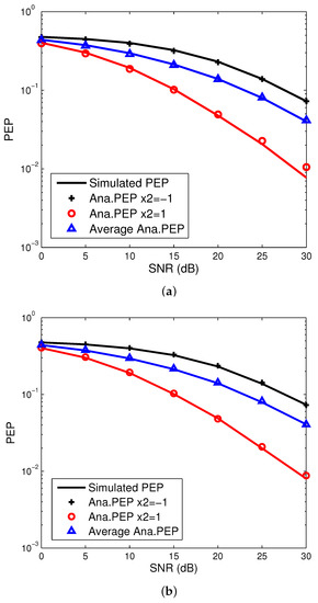 In Figure 2, we evaluate the derived closed-form PEP (21) for the first user compared with the simulated PEP. It is worth pointing out that the PEP of the first user is associated with when is fixed. The solid lines represent the simulated PEP, while the markers denote the analytical PEP. The average analytical PEP is obtained by taking the average of both cases . As seen in Figure 2a,b, the accuracy of the closed-formed PEP is related to the value . When , the analytical PEP with is evidently inconsistent with the simulated PEP at SNR = 30 dB, which is due to the approximation error of finite series representation of . However, the analytical PEP almost agrees well with the simulated PEP when .