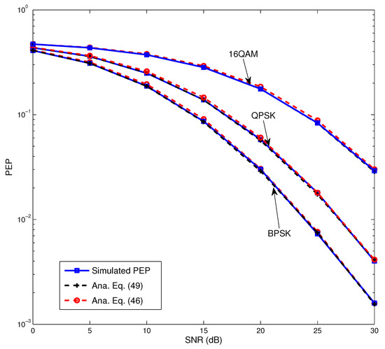 Figure 3 verifies the accuracy of the derived analytical closed-form PEP expression for the second user. Whichever modulation is adopted, the closed-form expression (46) in Proposition 2 is consistent with the simulated PEP acquired by random Monte Carlo simulation over Rayleigh fading channels. To preclude the influence of the approximate error of finite series representation of , (49) is provided for more reliable reference. Specifically, for (49), we use the existing MATLAB “Besselk” function to implement as a benchmark. As anticipated, the simulated PEP and the analytical in Equation (49) completely overlap. Meanwhile, Equation (46) Proposition 2 is totally in agreement with the other two curves when .