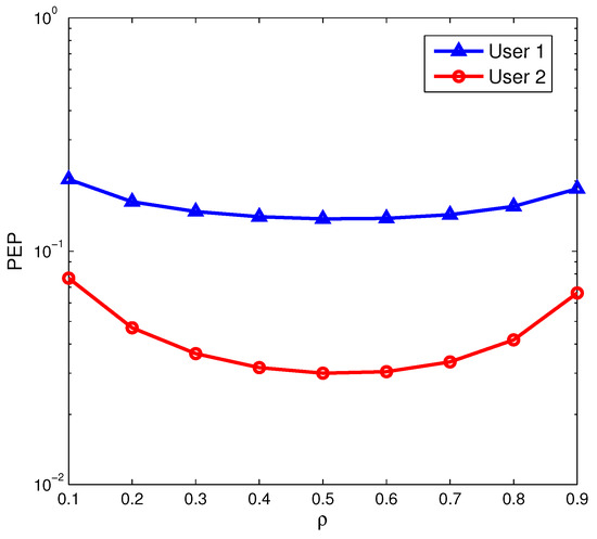 The impact of several parameter values on PEP is straightforwardly presented. The following three figures are simulated at SNR = 20 dB, and the average analytical PEP is evaluated for the first user. First, we observe the performance of PEP with varying PS factors for two users as seen in Figure 4. Fortunately, = 0.5 or 0.6 simultaneously corresponds to the optimal performance of two users.
