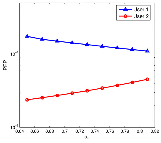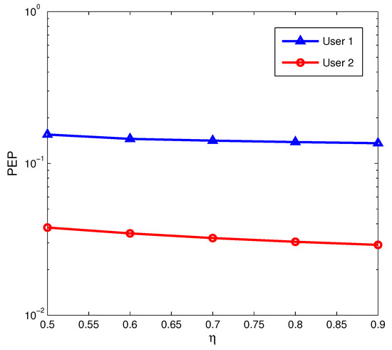 The effect of energy conversion efficiency on the error performance is explored as shown in Figure 6. For any user, only a slight change in PEP happens when varies from 0.5 to 0.9.