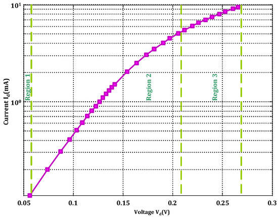 Using a specific high-accuracy voltage-controlled current source to ensure both protection of the device during the test process and accurate current/voltage measurements in the low current level region (below 1 mA), the static I/V characteristic of the ZBD was measured (Figure 3). By means of proprietary extraction software, the value of the thermionic-field emission model parameters [18] for the nonlinear current source (1) were obtained (Table 1).
