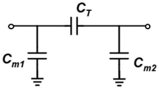 The above “π” network accounts for the total capacitance CT, as well as the small-value parasitic capacitances to the ground (if considered), Cm1 and Cm2, where CT is the sum of the junction capacitance Cj and the parasitic capacitances Cpp, as shown in Equation (2).