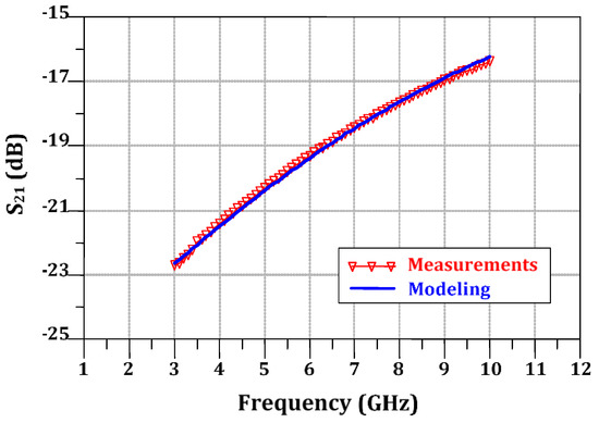 An accurate estimation of the total capacitance can be extracted from the measured value of the S21 scattering parameter (Figure 5) when a negative bias, Vd, is applied to the diode. Parameter S21 essentially depends on the total capacitance, CT (the junction capacitance Cj at Vd = 0 V, Cj0, junction potential, , and the parasitic capacitance Cpp). Scattering parameters of the diode were measured from 2 GHz up to 50 GHz; however, for capacitance extraction purposes, only the frequency range of 3–10 GHz was used, considering the equivalent circuit in Figure 4. By varying the negative Vd voltage applied to the diode, and performing the measurement of the scattering parameters of the diode at each voltage, it was possible to extract the values of the CT capacitance as a function of this voltage. In Figure 6, the extracted Capacitance versus Voltage (C-V) plot is presented. In Table 2, the values of the elements of the circuit in Figure 2, as well as the parameters of Equation (2), are presented.