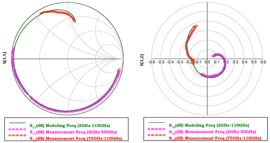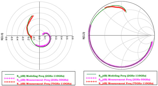 In Figure 7, the reflection and transmission coefficients from the equivalent circuit simulation are compared with the experimental measurements in two frequency ranges (2–50 GHz and 75–110 GHz) for the unbiased diode (Vd = 0 V). From these results, it can be concluded that the degree of agreement between both results is excellent. Therefore, the modeling procedure proposed provides a model that can simulate the behavior of ZBD from the DC up to 110 GHz.
