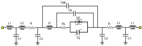 For modeling purposes, as a starting point, the diode equivalent circuit presented in Figure 2 is here considered. In this circuit, the main non-linearities (Id Current Source and Cj Capacitance), as well as parasitic elements due to metallization (Rs) and packaging (Cpp, Cp, and Lf), can be observed.