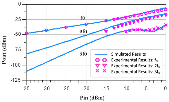 Simulated (continuous line) and measured output power versus input power. (Circles: f0, Inverted Triangle: 2f0, Cross: 3f0).