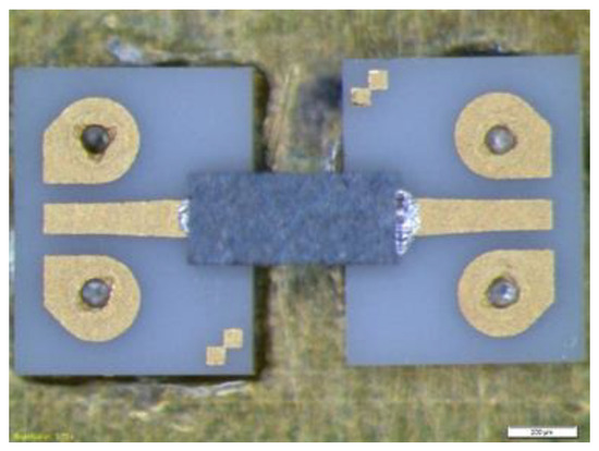The previous model is a basic general-purpose model, but particularly considering W-band applications, it was necessary to achieve a better approximation for the most commonly used attachment technique of the ZBD to the circuit assembly, while being well-based on the previously presented model extraction. Therefore, a new circuit was assembled by attaching a ZBD using the flip-chip technique, as shown in Figure 10. This attachment technique is the most critical in terms of the location of the diode, in order to achieve a symmetrical structure and to avoid destroying the finger of the diode by placing it in contact with the CPW-M transition. Please note that, to attach the flip-chip into a circuit, the chip must be inverted to bring the solder dots (made of H20E silver epoxy) down onto the connectors on the circuit board; then, the solder is re-melted (120 °C for 15 min) to produce an electrical connection, leaving a small space between the diode and the underlying mounting.