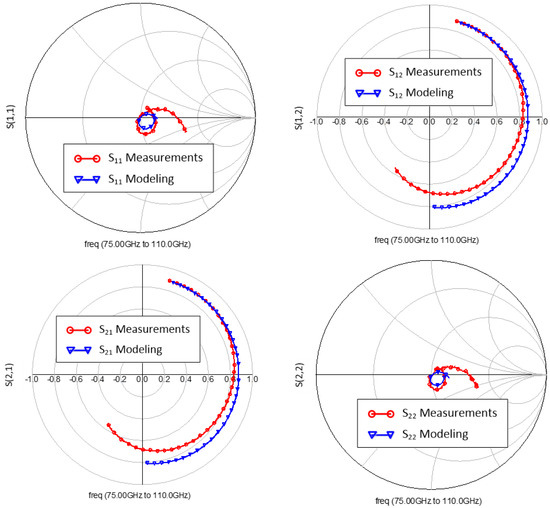As performed for the previously presented modeling procedure, CPW-M transitions were used, and their model was used in the optimization in Keysight ADSTM, in order to obtain an equivalent circuit model consisting only of the intrinsic and parasitic elements of the diode. A comparison between experimental measurements and the model (described below) simulation results is shown in Figure 11, showing a better match at the lower frequencies of the W-band.