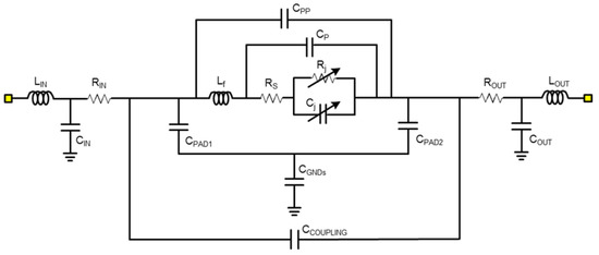 The resulting equivalent circuit model is presented in Figure 12. Comparing this equivalent circuit with the previous model (Figure 8), the main difference is that some capacitances have been added to account for some newly existing parasitic effects. In the flip-chip assembly, the diode was attached to the carrier upside down, compared to the conventional mode with bonding wires. Therefore, capacitances C2 in Figure 8 are identified in Figure 12 as CPAD1 and CPAD2, being connected to a new capacitance, CGNDs, which represents a new, slightly capacitive coupling effect between the microstrip reference plane of the diode bulk and the ground plane of the total circuit assembly. An additional capacitive coupling effect is thus originated, CCOUPLING, which is related to the capacitive coupling between the CPW-M transitions since, in this assembly, both transitions are placed closer than in the previous one. The LIN-CIN-RIN and ROUT-COUT-LOUT electrical networks simulate the microstrip line effect at the connection between the diode and the CPW-M transition; besides, RIN and ROUT also include the losses related to the H20E conductive silver epoxy used to attach the diode. It should be emphasized that fitting in Figure 7 covers the range from 2 to 110 GHz, de-embedding the effect of the wire bonding, while Figure 11 covers a frequency range from 75 to 110 GHz, comparing measurements and simulations without de-embedding. The upside-down positioning of the diode causes some uncertainty in the parasitic capacitances with the ground, but at the same time, other parasitic elements must be maintained for coherence with grounded-microstrip ZBD model (Figure 8). Those restrictions limit the capability for a perfect impedance matching.