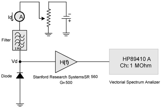 For a complete evaluation of diode performance, which is of significant use in detectors, a knowledge of low-frequency noise behavior becomes quite relevant—not only as proof of technology quality, but also to establish the noise floor, which limits the dynamic range. Thus, this ensures a stable response in a dynamic mode of operation. In this sense, a set-up was developed to measure and model low-frequency noise sources present in the ZBD, following [9]. The set-up diagram is shown in Figure 13, and the corresponding photo is shown in Figure 14. In this case, the diode was mounted in the conventional way (grounded, not Flip-Chip) inside a shielded box to avoid unwanted interference in the measurements. In this low-frequency range, a distinction between the flip-chip and wire bonding is not relevant.