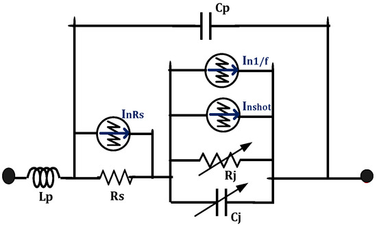 The main low-frequency noise contributions expected in the current spectral density (CSD) were: thermal noise associated with the series resistance Rs, shot noise, and flicker noise. The equations governing the different noise sources are given in Equations (3)–(5) (where K is the Boltzmann constant, f is the low frequency, q is electron charge, Is is the saturation current, and Idiode is the actual current, whereas Kf, af, and bf are parameters to be determined). Noise sources were placed in the circuital model of the diode, as shown in Figure 15.